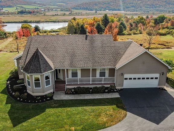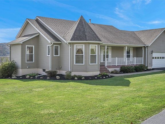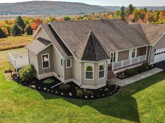 From the cross-gable roof, to the charming front covered porch, the front turret with the conical roof this house has stunning curb appeal. This immaculately maintained home on a nearly 6a., will instantly capture your attention and spark your imagination. Sit in the turret and enjoy morning coffee while you enjoy the view out the windows that surround you. Black Onyx granite counters, provide ample food prep/serving area, you may even look forward to doing the dishes at the corner sink with views of your property. A bump out in the living room creates another dining area or could be used as a media area or additional conversation space. The living room features a central stone gas fireplace flanked on either side with oversized windows with valley views. The spacious primary bedroom shares those same valley views from the oversized window, the en suite bath has a large walk-in closet dual sink vanity, water closet and addtnl linen closet. Smartly located laundry at the attached garage entrance. Need more room, addtnl living space could be achieved in the full basement with walk-out to lower patio, and a full bath, or leave it for shop/work space.Great House! Is it your new home?