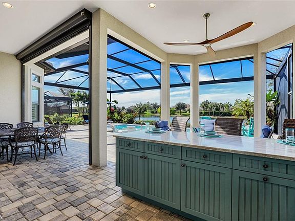 Francesco Model with FULL GOLF membership in sought after Esplanade. Endless sunsets from this southern exposure extended lanai. Expansive outdoor living area with custom outdoor kitchen, salt water pool and spa. With 3 bedrooms(all en suites) plus den, 3.5 bathrooms and 3 CAR GARAGE, this residence has a well laid out floor plan that flows gracefully from the interior to the outdoor living area. The 13’ trayed ceiling and crown molding add detail and elegance. The modern kitchen features a NATURAL GAS cooktop, double wall oven, oversize island, walk in pantry, custom cabinetry, under counter ice maker and separate bar with wine refrigerator. The master retreat showcases 2 plentiful closets with custom cabinetry, dual sinks and extra-large shower. Imagine being part of this amenity rich lifestyle; 18 hole Troon managed championship golf course (use your own cart), resort style pool, cabanas, tennis-bocce-pickleball courts, full service spa and fitness center with Techno Gym and aerobics room, dog park, Bahama Bar, walking/biking trails, and culinary center with wine tasting room. A short drive from downtown Naples dining, shopping, entertainment and white sand beaches.