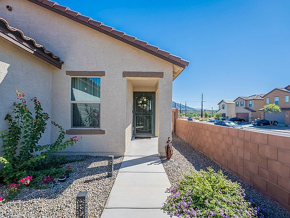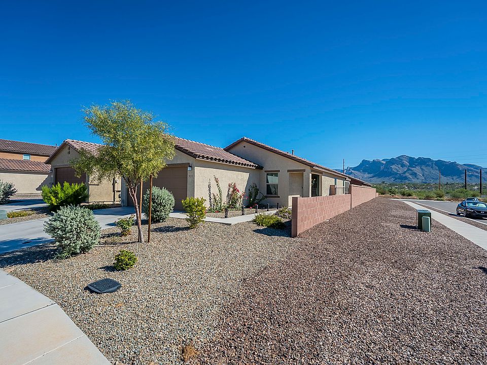 Location, location, location! Next to the Oro Valley Bike path, close to the Foothills Mall, stores, and restaurants. This 2022 corner lot home has mountain and sunset views, three bedrooms, two baths, a custom coffee bar with seating, a kitchen with a walk-in pantry with an outlet for appliances, and an island with extra cabinets. All rooms have upgraded ceiling fans, lighting, tile & carpet flooring, and custom window treatments. The primary bedroom has a garden tub, shower, and a walk-in closet with custom built-ins. The backyard features a screened-in patio, a TV mounted with power, a shade-providing pergola swing, a gas outlet for the grill, and a beautiful landscape for entertaining. This home is in a great school district with many options. It's a must-see!