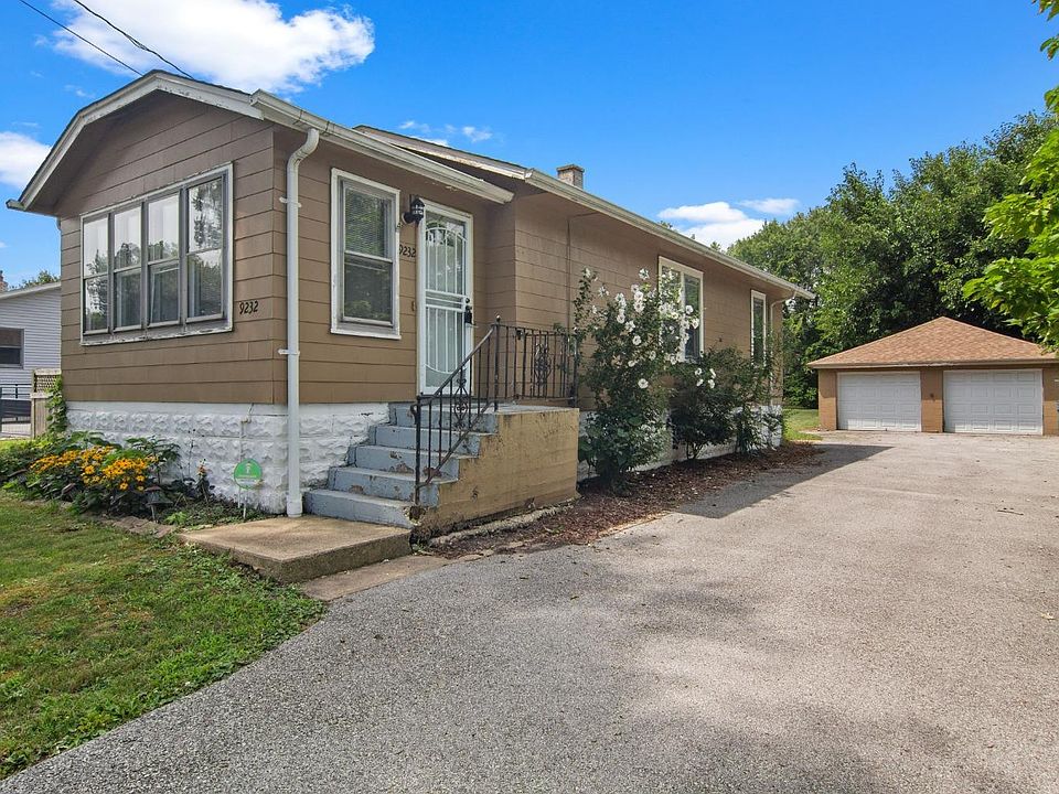 CONSIDERABLE PRICE IMPROVEMENT!! 3/4 of an ACRE in town and what a great location!! Close to all the Highland conveniences, this home is a great find for investors for rental or renovation! Enter into the enclosed front porch full of windows that offers great natural light as you enter into a large living room. The living room opens into the sunny dining room with hardwood floors and built in hutch. Two bedrooms and full bath complete this bungalow floor plan. Enclosed back porch area off the kitchen can offer additional space for storage needs. Large cement block 2 car garage, totally fenced yard and shed. Some updates within the past 10 years include roof on home and garage, fence, garage overhead door, furnace & C/A, windows, carpet, front & rear exterior doors and storm doors, new electrical breaker panel.