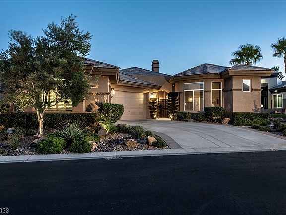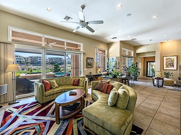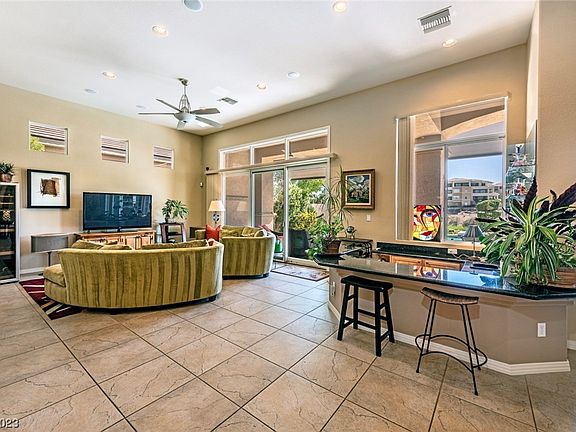 Welcome to the rare opportunity to live in the serene gated community of Canyon Terrace! This beautiful single-story home offers the perfect blend of luxury and comfort. The primary bedroom greets you with fantastic morning sunrise views over the pristine TPC Las Vegas golf course. Skylight tubes bring sunlight into the primary en-suite bathroom and highlight the gorgeous glass block shower and expansive fully built out walk in closet. This residence features a spacious open floor plan with elevated ceilings, stunning stonewall fireplace, sunken bar, and three sliding glass doors to the covered patio complete with fully retractable shades - perfect for year round outdoor entertaining. Dive into the pool on hot summer days or relax on the viewing pad overlooking the golf course to enjoy tranquil sunsets over the mountains. Do not miss out on this Summerlin gem!