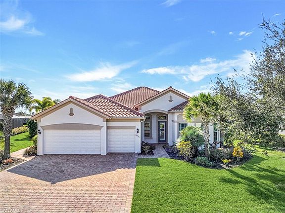 The moment you walk through the front door, you will be greeted by the SPECTACULAR VIEWS of Stone Lake, one of the largest community lakes in Southwest Florida. With this southwest exposure you will stay warm while enjoying the sunsets from your lanai or outdoor patio. Don't forget to bring your boat as this home comes with a deeded dock. The wide-open floor plan includes 3 bedrooms plus den and 3 full baths. The zero/corner sliders open up to let the outside in. This home comes with many upgrades including, upgraded cabinetry throughout, quartz countertops, stainless steel appliances, tile throughout, crown molding, plantation shutters and a 3-car extended garage. This home includes an IMMEDIATE opportunity to purchase a golf membership at the NEWLY RENOVATED Hurdzan Fry Championship Quarry Golf Club. The Beach Club is undergoing a one of a kind $18M renovation project. The brand new 2-story wellness center has recently opened as well as the new pickle ball and bocce ball courts. The expanded tiki bar and beach club restaurant is scheduled to open the summer of 2023. The Quarry also offers tennis, a lap pool, resort pool and a full-time activities director.