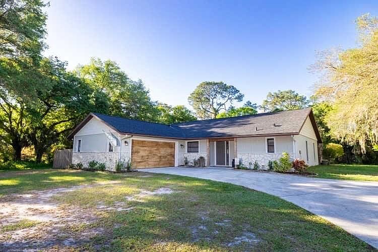 With lots of country charm but proximity to everything, this recently renovated, three-bedroom, 2.5-bath home sits on a quiet cul-de-sac in the esteemed neighborhood of Braden Woods. Sitting on just over an acre lot, lined with beautiful oak trees, nestled at the back of the property, find the peace and solitude this home offers. Enjoy stunning sunsets from the back porch, a large yard, plenty of privacy, a refreshing saltwater pool, a spacious living area, and ample storage. Garage with custom cabinetry and shed on property. A bonus there is plenty of room to bring your Boat or RV. New roof in 2023, HVAC replaced in 2016, new stainless steel appliances, many recent renovations done 2023-2024; well maintained. Location is everything, and this one is perfect!