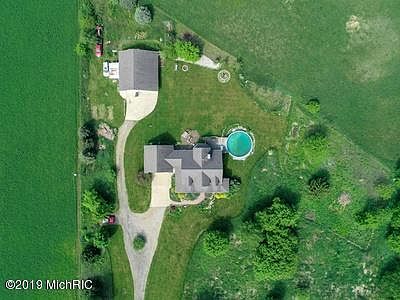 ing 5 + bedroom home nestled on 4.11 acres in Award winning Byron Center school system. The modern kitchen with a large eating area is a gathering place. The living room features vaulted ceilings, large windows for lots of natural light and large field stone fireplace. The master suite and laundry are on the main floor for convenience. The upper level has 2 more bedrooms and a great view from the lofted hallway. The lower level feature 2 more bedrooms and a full bath. Basement is totally finished with in wall surround sound system and bar for entertaining. There is also a large area for storage or can be used as a wine cellar. Enjoy the quiet of the yard from the large wrap around porch or the above ground pool. A 30 x 40 pole barn with electric, loft, roughed-in plumbing is a real bonus to this home. New cement driveway is a nice addition.
