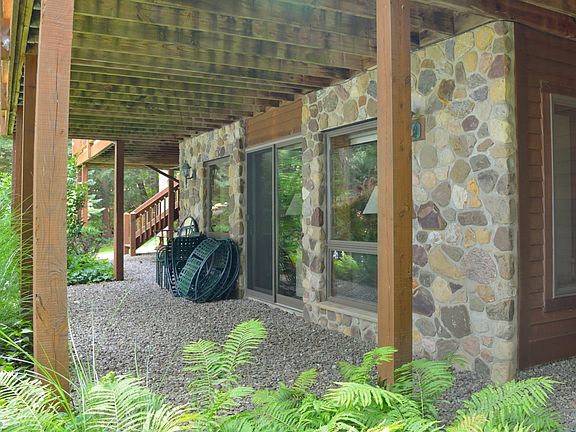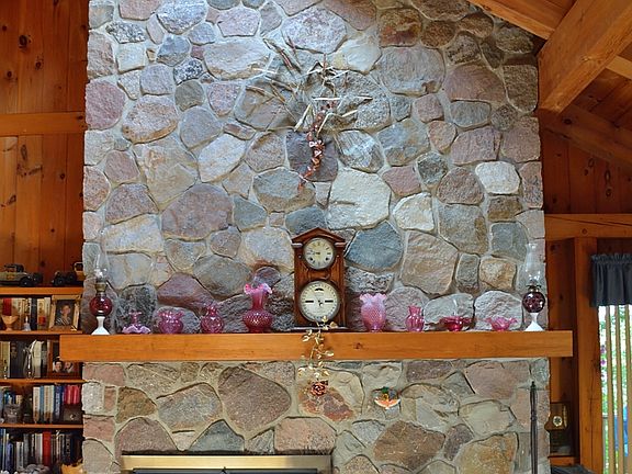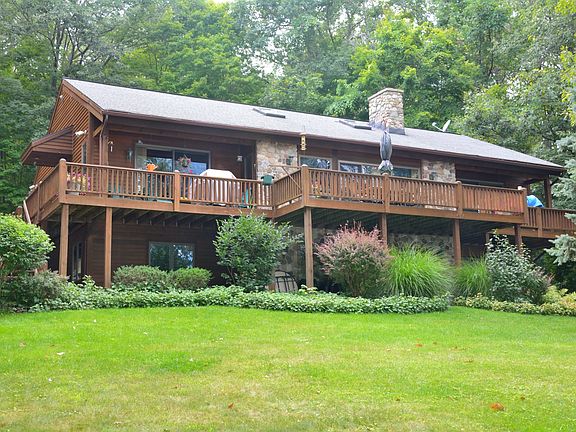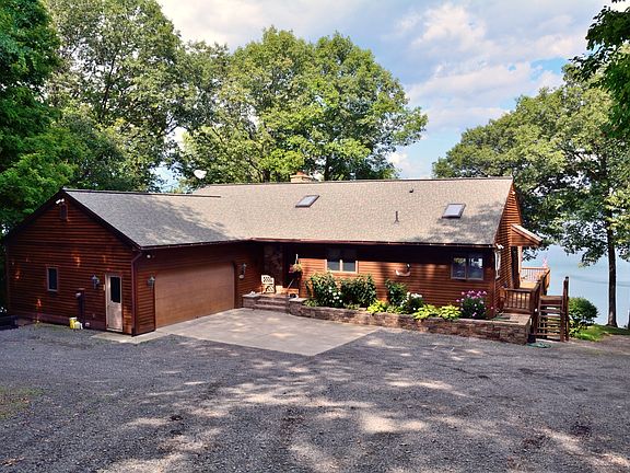 Live the lakefront dream. 3 bed, 3 full baths on 7 acres of private land. 200 ft of frontage, beautiful large beach area accessible by car! Post and beam construction, cedar siding and fieldstone accents. Lovely landscaping, cathedral ceilings, skylights, ceiling fans throughout upper level. 5" pegged oak hardwood floors, natural fieldstone fireplaces inside and out, main level master suite, expansive lake-side deck with spectacular views. Boathouse with roof deck and boat track system. 8ft x 65 ft dock with galvanized box beam construction. 2 outbuildings for storage and workshop.