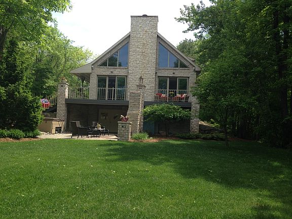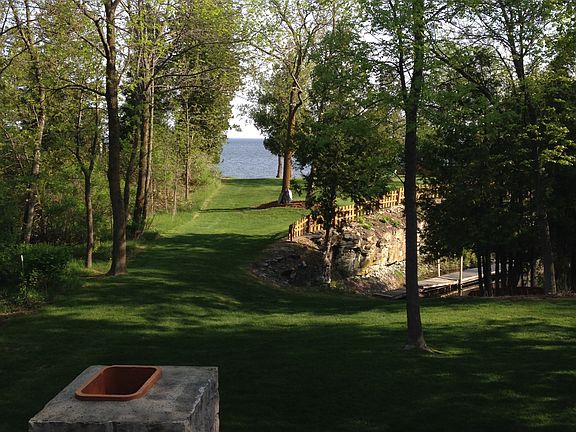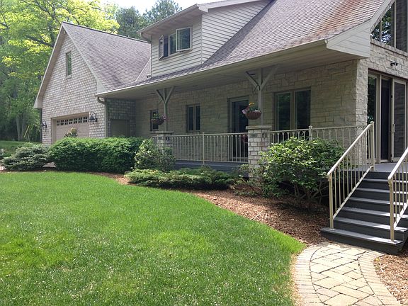 1-1/2 story all brick and stone exterior. Beautiful view to the bay. Two 9 foot patio doors with a two story all stone fireplace.Professionally landscaped yard with a 10x35 composite deck overlooking lower paver stone patio with outdoor fireplace and hot tub overlooking the bay of Green Bay. Open concept kitchen to great room with loft. Knotty hickory floors throughout the home. Natural cherry cabinets and wood work. Granite and ceramic in the kitchen and bathrooms. Lower bathroom has a ceramic shower. Appliances included. Open beam concept on the first floor with 10' ceilings and all wood 22' cathedral ceiling in the great room. A 4"6' stairway leading up to the loft, master suite and bonus room. Master bedroom has all wood Cather ceiling and walk in closet. Master bathroom has an all ceramic shower and whirlpool tub. Bonus room is 14'x35' with a 12'x14 closet. Black wrought iron light fixtures and wrought railings on the interior of the home. 25x35 finished garage with black cabinets with staircase leading to a full unfinished basement with 7' walk out doors to patio below.