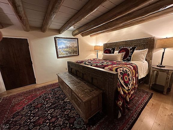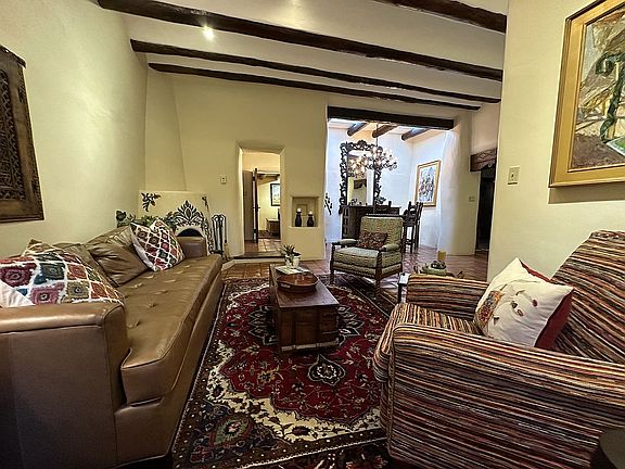 This classic Santa Fe adobe home has a rich history, but all the modern comforts. Built by famous artists Gerald and Ina Sizer Cassidy in 1930, marks of the original craftmanship remain, but the home has been maintained and updated throughout the years. This home is one of only a few with a Canyon Road address and a two car heated garage plus ample off street parking. The four courtyards expand the living space into the outdoors. The home features a main house as well as an attached guest house with its own entrance and kitchen. Perfect for welcoming guests or multigenerational living. New roof in 2023.