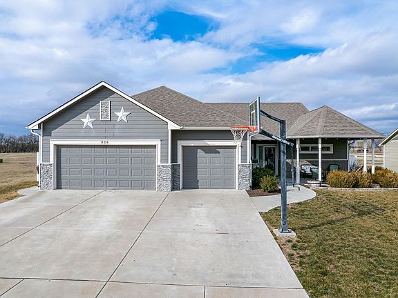 Beautiful 6 bedroom, 3 bath Ranch Home in the desirable Mulvane School District. Popular open concept living, dining and kitchen are with quartz counter tops throughout. High ceilings and large windows in kitchen/living room area make it a bright happy space to spend time with friends and family Primary suite features luxury bath with dual quartz sinks, jetted tub, separate shower and walk in closet. In the basement you will find a large family room with wet bar, 3 bedrooms, 1 bath and large mechanical room. The spacious back yard features a white vinyl fence with close access to the Mulvane Sports Complex. The exterior of the home features concrete siding and impact resistant composite roof. Enjoy quality outdoor time with a covered patio on the front and back porch.