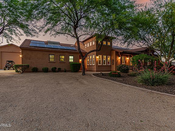 Embrace sustainable luxury in this 5-bed, 3-bath energy-efficient gem showcases! This fully-fenced value features a 2-car and 800 sqft RV garage, mature landscape, & a welcoming front porch. Awe-inspiring interior boasts sheer beauty & spectacular detail! Discover the large living room complemented by a fireplace & French doors to the back patio. Highlights include wood-look & tile flooring, stylish light fixtures, high vaulted ceilings, formal dining room, & an open den ideal for work or play. Chef's kitchen displays stainless steel appliances wall ovens & cooktop gas, subway tile backsplash, quartz counters, ample cabinets & cupboards adorned w/crown moulding, a custom island w/a breakfast bar, & a breakfast nook. This large lot is perfect for all your toys and animals! Horses welcome Plush carpet, direct outdoor access, an ensuite w/dual sinks, make-up desk, soaking tub, & a walk-in closet complete the picture. HUGE backyard offers a covered patio, built-in BBQ, storage shed, shimmering pool w/rock waterfall, and a rooftop providing breathtaking sunsets behind the mountains. Don't miss this one-of-a-kind home!