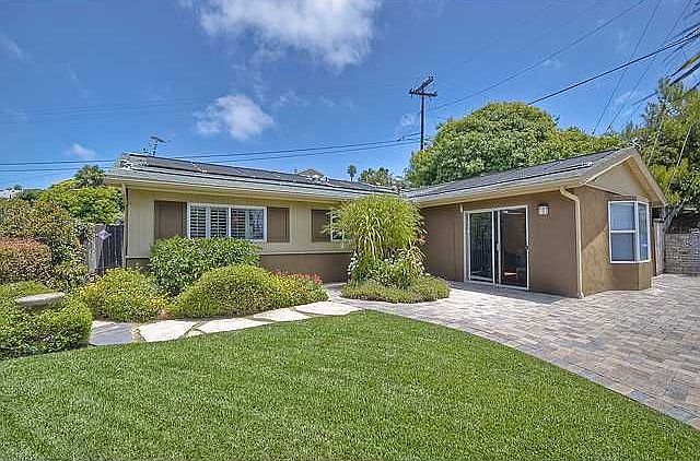Move in ready! Three bedroom, two bath single level home with a pool is walking distance to the beach! Home shows like a model. Great curb appeal making this a quick easy to love sale. This beautiful home has NEW WIRING tile and bamboo wood flooring, vaulted ceilings and dual pane windows. The back yard is fully landscaped with flag stone decking, and pavers in the patio area.