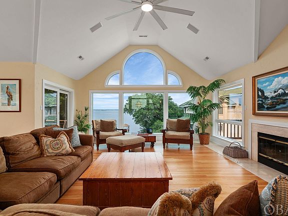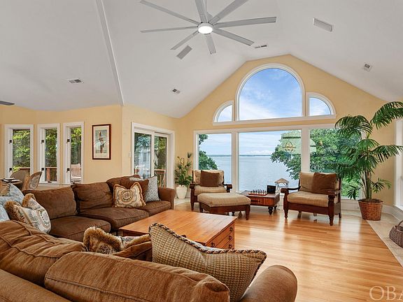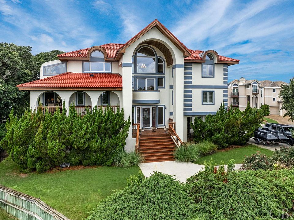 Are you searching for a sound front villa that boasts impressive architecture and manicured landscaping across two parcels, with over 3,700 square feet of living space? Enjoy phenomenal water views from practically every room in this stunning property. Featuring an open reverse floor plan, this home offers 5 spacious bedrooms, including 3 en suites, and two distinct family rooms. Multi-level expansive decks, a sound front dock and gazebo, and the amazing community amenities of Monteray Shores complete this exceptional offering. Well maintained and used only as a cherished second home getaway, this coastal estate must be seen to be believed. Elegant and inviting, this property maximizes the incredible views and floods the interior on each level with natural light through its expansive windows and sliding glass doors. The sunroom off the kitchen is an especially breathtaking space, bringing the natural beauty of the Outer Banks inside. The unique elements of the property featuring round arches, half-level transitions open to the level below, cathedral ceilings, and marble flooring in the foyer create a sophisticated flow throughout the home, enhancing its open and airy atmosphere. The distinctive red tile roof and classic curves of the exterior hint at the singular upscale style within. This villa offers the luxury of three spacious en suite bedrooms, each located on a separate floor for maximum privacy and comfort. Each bedroom features a private bathroom with double bowl vanities and separate shower, providing a spa-like retreat. This thoughtful design ensures that every level of the home enjoys its own spacious and elegant sanctuary. At the heart of the mid-level, a second informal family room with a wet bar is ideal for gathering or entertaining. Stunning sound views with direct deck access allow an effortless extension of living space outdoors, making it an ideal setting to appreciate the beauty of the surroundings. Two additional guestrooms, a full hall bathroom, and a laundry room complete the mid-level. Combining two parcels establishes an outdoor oasis on the sound front unlike any other. A sprawling lawn bordered by a mature hedgerow stretches gracefully to the pier and gazebo. Not only private, this picturesque outdoor haven is also a window to the awe-inspiring sunsets the OBX is known for. Over 28,800 square feet of property borders both Marina Court and Monteray Dr. The Monteray Shores community amenities are nearby offering a clubhouse, swimming, tennis, a playground, and more. Located within proximity to the shopping and dining of Corolla, this property is ideal for a second home getaway or vacation rental investment. Truly an impressive coastal estate, this elegant and spacious villa, with so many special features and a style and uniqueness all its own, must be seen to be fully appreciated.
