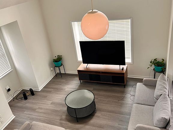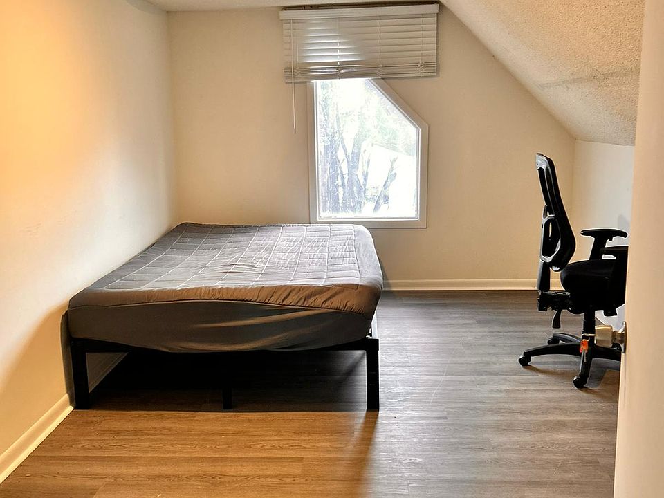 Newly renovated private room, well lit, newly furnished with a new wooden desk, a bed and a chair. Portable closet, one window with modern blinds. Room is on the first floor with easy access to the living room and other shared spaces. The house contains four rooms, two full bathroom and an half bathroom. This room will share a bathroom, the living space, washer, dryer and the kitchen. Ideal lease term is 12 months. No smoking. Each room gets a parking spot.