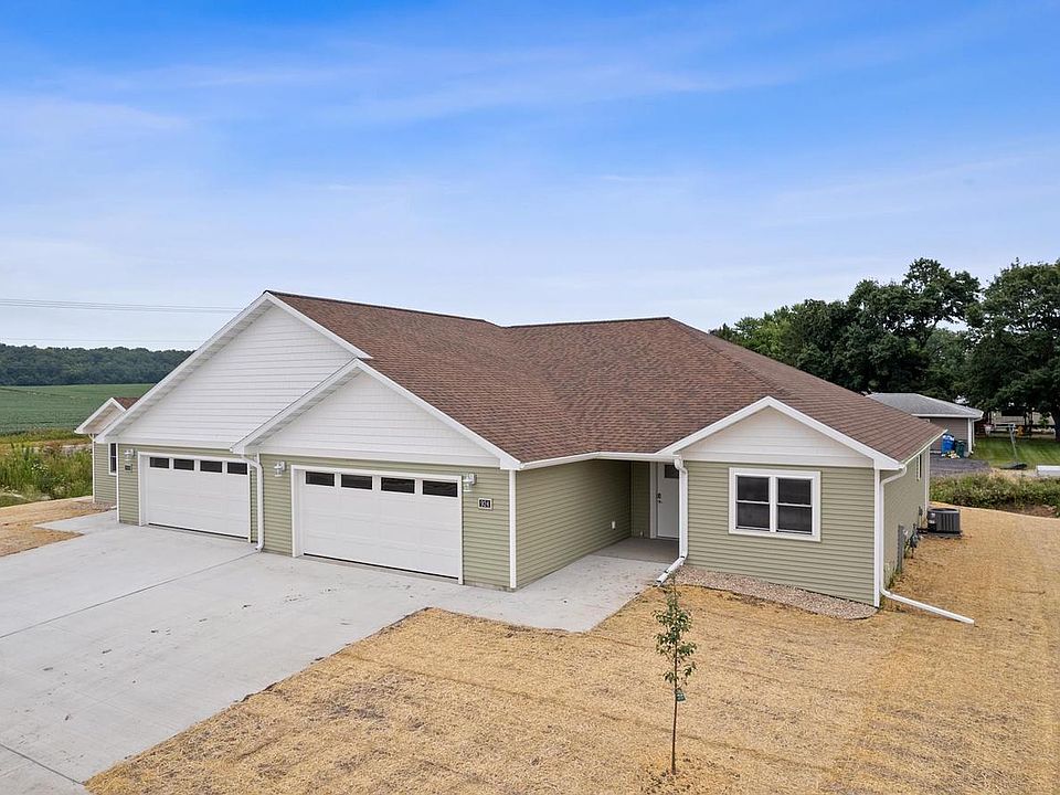 This zero lot line offers an open concept, 2 bdrms, 2 baths, main level laundry & covered back porch. Enjoy quality finishes including Amish-made self closing cabinetry, quartz counters, LVP flooring & stainless appliances. Lower level has egress windows and stubbed bathroom for future expansion. Each 2-car garage features an electric vehicle charging port. Neighborhood perks include city sewer/water, sidewalks, future park & conservancy with trails! Less than one hour drive to either side of Madison! Bedroom is the basement in partially finished (no flooring).