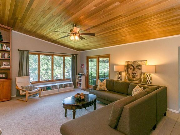 A gardener's paradise that feels like a treehouse! You will love the vaulted redwood ceilings in the main level, floor-to-ceiling cherry bookcases & large windows that look out over the gorgeous backyard filled w/ mature trees, perennials & a water feature. The spacious kitchen offers cherry cabinets, Corian counters & updated appliances. The huge master BR has an enormous walk-in cedar closet, separate sitting room & private bath w/ whirlpool tub, dual vanities & separate shower. It's even on the bus line!