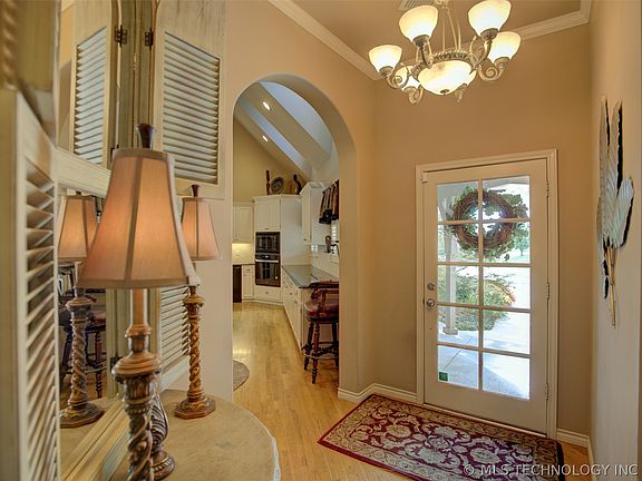 Beautiful one story home in Jenks schools on corner lot across the street from walking trails and pond! Split floor plan with large eat in vaulted kitchen that opens to living room with stone fireplace. Separate office with outside entry. Back yard is a gardeners paradise with extensive landscaping, covered patio, large Koi pond with waterfall and decorative lighting.