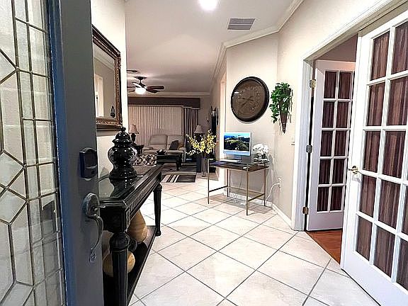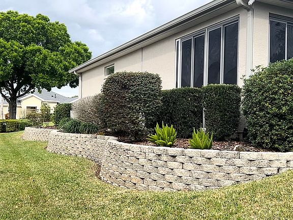 You don't want to miss this. Call owner directly (337) 886-8064. A Granville Model with Curb Appeal! This two bedroom plus a study is professionally landscaped with a stunning wrap around retaining wall, brick pavers adorning the driveway and walkway, mature foliage, showy blooms, topped off by a partial view of the golf course from the front of the home. New Roof (2021), New AC Heat Pump and Compressor (2022). New Mini-Split installed 2022 for an ADDITIONAL 400 SQUARE FEET of enclosed sliding glass door lanai space under heat and air! Crown Molding throughout, Rounded Corners, Double-door entry, No Carpet, Travertine Tile in wet areas. Stainless Steel kitchen appliances, French Doors to office/study, central solar tube, designer ceiling fans, designer light fixtures, custom valance spanning length of great room, easy step-in Double Showers, Oversized Garage (26x20) with a separate 8x5 Golf Cart /Storage Area. Black, electric garage Privacy Screen (slides up); matches black drip edge. Lanai has 220V plug and hose for a hot tub (no hot tub or golf cart included). Located in Del Webb Spruce Creek, home of Eagle Ridge Golf Club, a gated golf course community offering multiple courses, waterfall entrance, 24/7 guards at entrance, indoor and outdoor swimming pools, pickleball and bocce ball courts, clubs, and other amenities. Gym membership included in HOA fee. Close to Horizon center and far enough away from pickle ball courts to sleep-in peacefully. Short drive to the Villages Spanish Springs square area, Hwy 441 retail stores and restaurants, and all the shopping and entertainment that Ocala and the World Equestrian Center has to offer. Call owner directly (337) 886-8064. Video of a walk-through can be viewed at https://youtu.be/YZraxj7NGSM?feature=shared