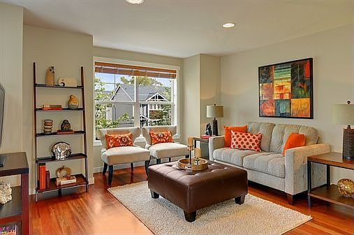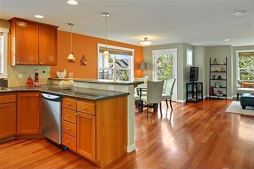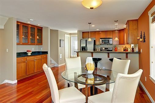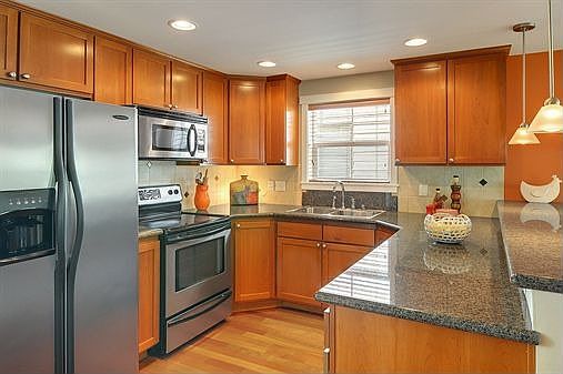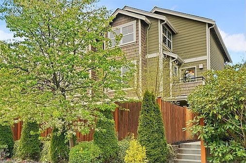 Spacious in-city townhouse with large main-floor layout and private fenced patio! Enjoy 1,320 sq ft plus attached garage with easy access. Three-bedrooms all with private bathrooms and a powder room on the main floor. This front-facing unit features Brazilian cherry wood floors and cabinets, slab-granite counter tops and custom built-in buffet. Quality finishes include natural stones, travertine marble and tile accents. Master suite boasts large walk-in closet. Live on a quiet north Green Lake street in a super-convenient location close to parks, public transportation and freeways. Just a block away from Licton Springs Park!