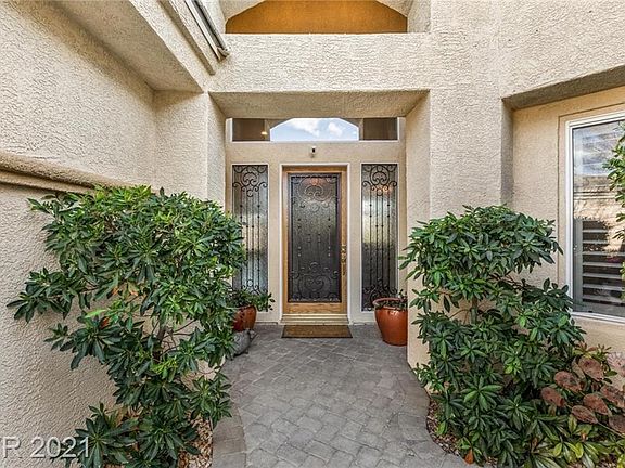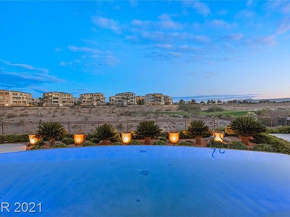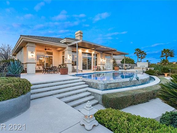 Unique single story home with views of TPC golf course, desert landscape, and the jewel in the crown of Summerlin Village is a fine option for anyone who wants a prime location, lifestyle convenience, and a private pool and spa, all encompassed in a home with luxury features. The expansive semi-enclosed kitchen features a window-wrapped breakfast nook, a pass-through counter to the great room, plenty of storage, an island cooktop, stainless steel appliances, and granite countertops. A semi-circular walk-in wet bar is conveniently located to serve both indoor and outdoor areas. In addition to the luxury, this residence boasts an interior floor plan that presents furnishing and lifestyle options. The formal dining room has sliding patio doors to the patio with a delightful view. The primary suite has private foyer access through double doors, calming fireplace, and french doors to access to outdoor spa & pool. Canyon Terrace is just minutes from some of the city's best venues!A must-see!