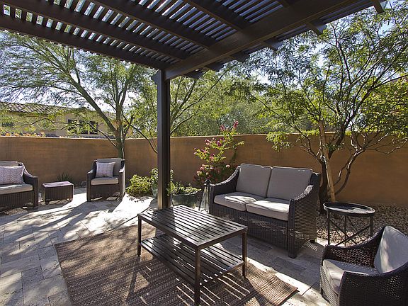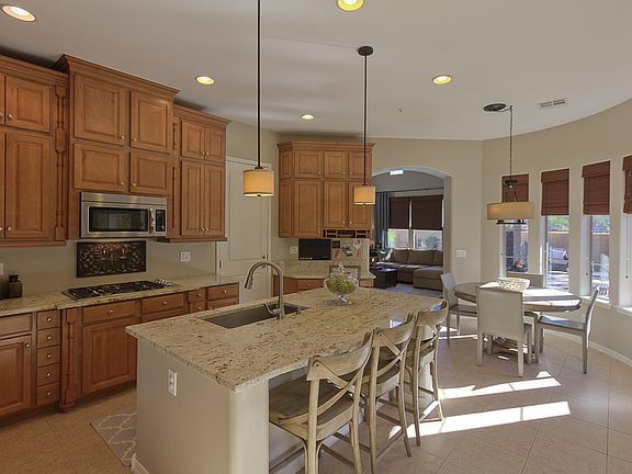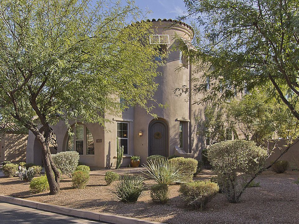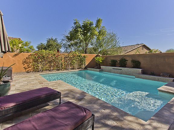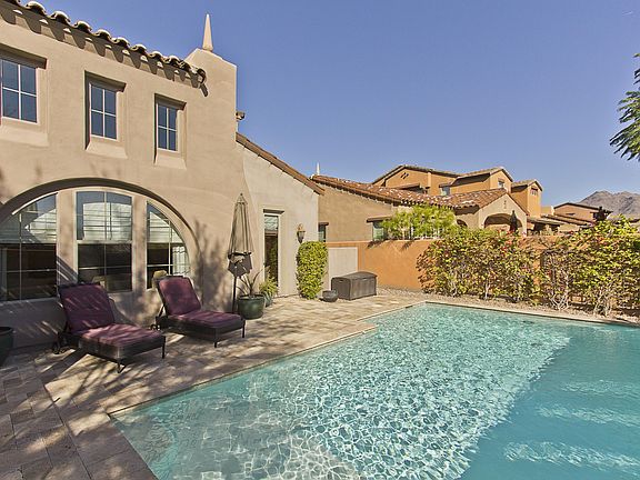Immaculate 3 bedroom, 2.5 bath home situated on one of larger lots in the Parks at DC Ranch. Eat-in Kitchen is bright and updated, featuring a large center island with breakfast bar,granite slab counters,upgraded cabinetry,stainless steel basin sink, 5 burner gas stove, dual wall ovens and a butler's pantry conveniently located near the formal dining room. Kitchen flows into family room with stylish wood flooring, stacked stone gas fireplace, and custom woven wood blinds and draperies. Multiple doors lead to gorgeous outdoor setting with private pool (installed 2012),two pergola patios with travertine pavers, a spacious side yard with low maintenance artificial grass and a mountain view! Located in highly sought after DC Ranch with private gate,large private park, two community centers.