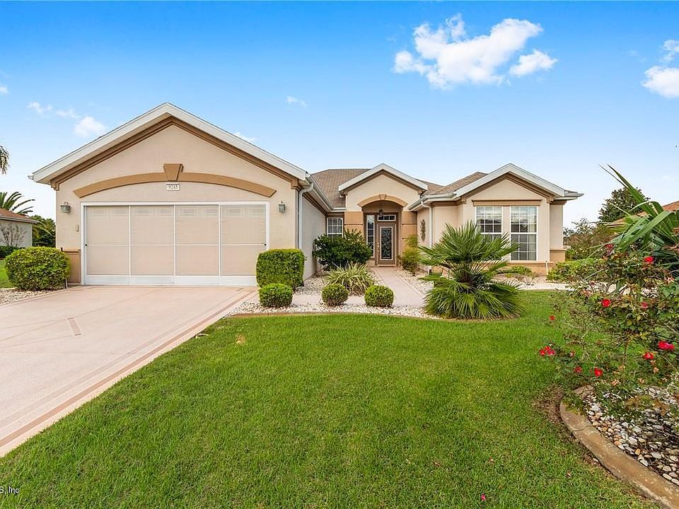 Spacious 2/2 with enclosed lanai under heat and air with river rock flooring. This lovely Madeira with golf course views and extended garage sits on a cul de sac, beautifully landscaped. Kitchen has Corian countertops, wood cabinets and bay window in the eat-in kitchen area with breakfast bar. Master bedroom bay window has built-in window seating with drawers. Guest bedroom has desk and storage built-ins. Comfort height commodes in both bathrooms and master bathroom has new shower doors. The kitchen boasts a Bosch dishwasher only 1 year old, as well as a new garbage disposal. Laminate throughout except carpet in bedrooms. Washer and Dryer can easily be returned inside the home from the garage. This home has a huge back patio from which you have golf course views.