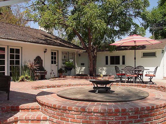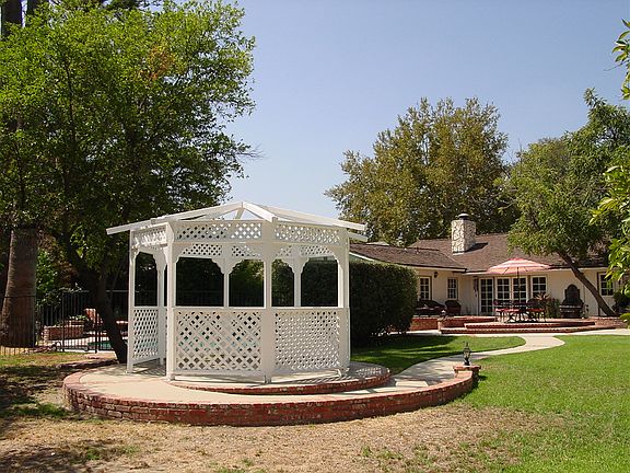 As your home you are free to roam, note the large lot. Located in the desirable Northridge Estates, a sprawling ranch house design plus a guest house. 3 bedroom & 2.5 baths in an approx. 2300 square foot home. Formal entry welcomes you with the warmth of pegged and grooved wood floors. A generous sized living room with beautiful cathedral style open beamed ceiling, brick fireplace and built in shelving and cabinets on each side, a windowed wall with French doors that open to the expansive brick patio. 2 sky-lites to brighten area. The kitchen retains its knotty pine cabs, some with glass doors, tile counters, double oven, used brick floor, a charming window that looks to the green lawn & mature landscaping just in case you have to do dishes. Formal dining with beamed ceiling, a brick combo fireplace/BBQ and a windowed corner seating area. A large den with French doors, (if you did a clever closet you could have bedroom 4.) Master with built-in cabinets and drawers and double sink bath. Secondary bedroom set-up as Jack and Jill. Outside look for a charming white gazebo, wrought iron enclosed sparkling pool, fruit tree, tall evergreens and towering palms along with green grass galore. Guest house is 1 bedroom & 1 bath with open beam and wood cabinets and kitchenette.