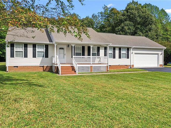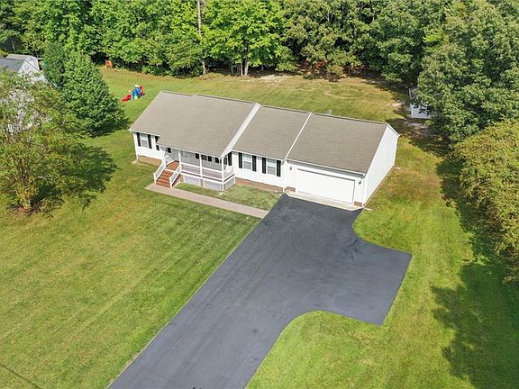 This spacious Ranch-Style Home sits back from the road with a beautiful driveway on nearly two acres of well groomed land. Enter by the covered front porch with room for rocking chairs, or park in the finished 2-car garage with space for hobbies & toys. The central living room spans front to back with vaulted ceilings and brand new carpet. The kitchen features upgraded cabinetry and newer stainless steel appliances. The primary bedroom is generously sized, with ensuite bath and walk-in closet. Two additional bedrooms share an interior vestibule and updated bathroom. Plenty of natural light and storage space. Outside there's plenty of space to relax and play or build a detached garage. Covered front porch, back yard deck, and a very nice storage building/workshop on a slab. This home is EXTRAORDINARILY well maintained. New insulation, vapor barrier and dehumidifier in crawl. 3-YO driveway. Generac generator. 6-YO Trane heat pump. LG Washer and Dryer convey.