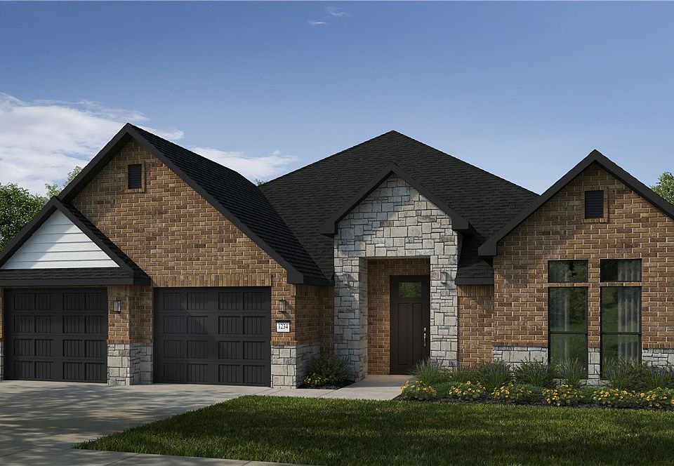 The 2800 floor plan offers approximately 2,800 square feet with 45 bedrooms, 3 bathrooms, and a bright, open single-story design. Wood-plank tray ceilings in the foyer and above the kitchen island add warmth from the moment you enter. The main living area features a vaulted ceiling with a stained box beam, a large window wall, and an optional fireplace with built-ins, plus a vaulted back porch for effortless indoor-outdoor living. The kitchen includes a spacious island and an oversized walk-in pantry, while the dining room is highlighted by a stylish accent wall and a layout that flows naturally into the family room. The primary suite features a vaulted ceiling, a freestanding tub, a glass-framed shower, and a generous walk-in closet. Secondary bedrooms are well-positioned for privacy, and the laundry room includes a built-in sink.