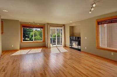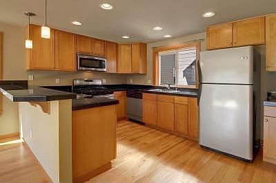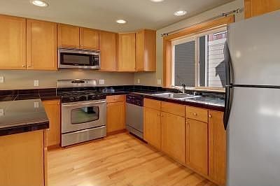 Immaculate 3 bedroom Townhome with garage near Green Lake. Great room feel with light & bright open living room with hardwood floors & gas fireplace that is open to the kitchen with granite countertops, stainless steel appliances, walk in pantry & breakfast bar. Nice balcony that enjoys views of Licton Springs Park across the street. Upstairs bedrooms have vaulted ceilings & fans. Large bath with double sinks, tub & separate shower. One bedroom & bath on lower floor. All appliances included.
