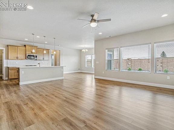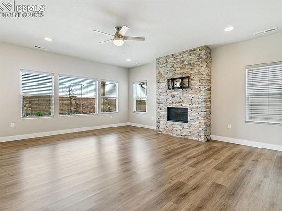 Your dream one level living - 2357 sq ft, only 2 years old and it's better than new! Already low maintenance landscaped, and has 6 foot privacy wall, blinds, storm door, fireplace TV mount, fireplace blower, garage door insulation, and washer & dryer. Stare out the office window at Pikes Peak. The Mont Blanc floor plan was designed for the true modern homeowner looking for open-concept, main-floor living. The great room overlooks the covered patio and opens to the spacious kitchen with large island, gas cooktop, double oven, microwave, walk-in pantry, and dining area. Lovely master suite features a large walk-in closet and master bath with walk=in shower and dual vanity. Homeowners will love the 3 car tandem garage, central air, 5 ceiling fans, and luxury vinyl plank flooring. It's a rare find!