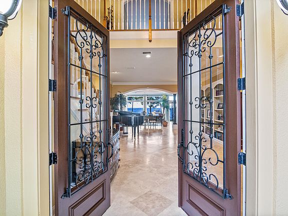 Welcome home to this spectacular riverfront residence on a beautiful .75 acre waterfront estate lot on the RIVER in sought after Bayside community that features 4 bedrooms, 4 1/2 baths, bonus/media room, fantastic river room, indoor pool, spa, summer kitchen, & dock with boat house, lift & jet ski lifts. Impressive features include 2 story entry foyer, front & rear staircases, wood floors & travertine tile, built in cabinets & shelves, wet bar, 2 fireplaces, central vacuum system, & atrium doors with in glass blinds. Chef kitchen features raised panel cherry cabinets, built in desk, island, and granite. Private owner's suite has fireplace, built in entertainment center, & granite vanities. Outstanding gated community with amenities you must see to appreciate is a great place to call home.