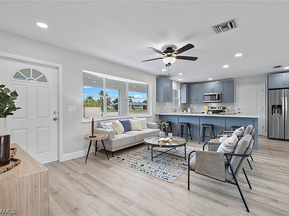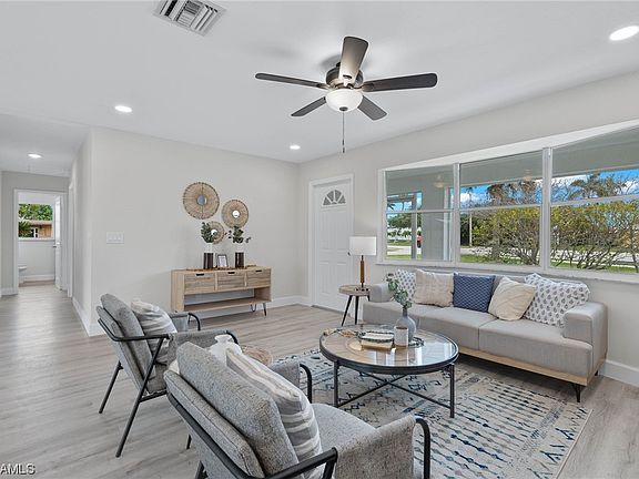 This Cape Coral Yacht Club home has just underwent an extensive No Nonsense Luxury Renovation & it just happens to be less than 5 minutes from the booming Downtown Cape Coral Dining & Entertainment district, the Yacht Club Public beach, which is about to under go an multi-million dollar renovation & the Cape Coral Bridge to Ft Myers. Outside you will find a Large Oversized Corner Lot, a New A/C System, New Electrical Panel Box & Mast, Updated Plumbing, an Updated Brick Paver Rear Patio with a Fire Pit Area, an Expansive Driveway that fits multiple cars, an oversized 1-Car Garage, a Screened Front Porch & an Irrigation System. Inside you will find New Vinyl Plank Floors thru out, a New Kitchen w/Shaker Cabinets, Quartzite Counters, Stainless Steel Appliances & a Subway Tile Backsplash. There are New 5” Baseboards, New Paint, New Fans, Lights, Fixtures, Sinks, Faucets, Interior Doors & New Bathrooms featuring a Primary with a New Shaker Vanity with Dual Sinks, & a Custom Tiled Shower & a Guest Bath with a New Shaker Vanity & Tiled Shower with New Tub. There is a Large Screened Rear Lanai overlooking the private Fenced backyard. Home would make a great Vacation Rental due to location & condition and existing Furnishings can be purchased separately from the stager. The Cape Coral Yacht Club neighborhood is booming with many multi million dollar homes under construction!!!