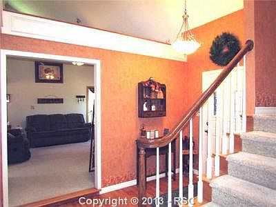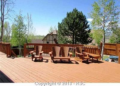 WOW! Impressive view of Pikes Peak! Beautiful 2-story with walkout bsmt, 6 bedrooms, 4 BR on UL, Charming entry hall with beautiful staircase, beautiful hardwood floors thru-out, Huge kichen with lots of storage, pantry, workspace, breakfast/hearth room with Danish WB stove. Huge Mst bedroom has adjoining updated full bath, walkin + double closets. Updated powder room on ML, Fin. bsmt has 2 walk-outs, 1 to rear patio & 1 on side accessible from front, great for home office. Attic fan for summer comfort, see add. remarks BONUS ROOM off kitchen not included in sq. ft. is fully finished, closets, built-in bookcases, but has no heat. Could easily add baseboard electric heat. 45' deck with deck furniture to enjoy the view! Pella & new Hearthouse vinyl windows, stone coated steel roof. 24' x 8' garage addition for workshop or storage. Furnace new in 2007, Sprinkling system. Raised garden beds in back yard. Rear corner of lot adjoins open space, enjoy nature, wildlife galore. This immaculate, well maintained home has so much to offer!!