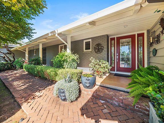 This home in the Sunset Terrace neighborhood is a mid-century dream! Built for welcoming and sharing, this home features distinctive, mid-century modern architecture with a signature ''floating'' fireplace surrounded by windows, featuring two solid brass flue pipes; windows fill the entire back side of the home opening onto a lush, landscaped yard. All windows and doors are energy-efficient, low-e, dual pane fixtures. The home has extensive built-in cabinets in the den/office, family room, dining room, laundry room, hallways, and bedrooms. All rooms have energy efficient ceiling fans. The backyard is lushly landscaped with blooming dogwood, crepe myrtle, and tulip magnolia trees, Japanese maples, apple, peach, and citrus trees, azalea, rhododendrons, gardenias, camellias, and hydrangeas, as well as iris, narcissus, hyacinths, peonies, and geraniums. It features a fire-pit seating area and a large pool with a diving board. The front yard is fully landscaped in drought-resistant perennials, floribunda roses, citrus and pomegranate trees, as well as Chinese elm and magnolia trees. Abundant storage throughout, including in the double attached garage and outdoor storage areas.