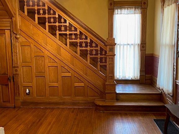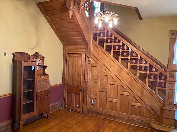 Victorian home built at the turn of the century offers dining rm with fireplace w/ original tiles incl images of Hamlet & Ophelia from Shakespeare. Pocket doors separate dining & living rms with a 2nd original fireplace. Lg foyer w/unique staircase. Lg master bedrm w/ 3rd original fireplace. Bonus rm off the master (possible nursery or 4th bdrm). A circular staircase leads to a 3rd level w/ 2 sm rooms & loft area. (Currently used for storage). All antique light fixtures throughout. Rugs remain (there is not hardwood under the rugs). 4 kitchen island chairs remain. Updates in 2021 include water heater, washer & dryer, the coil & blower on the furnace and the water line was replaced from the street to the house. Roof is apprx 10 yrs old.