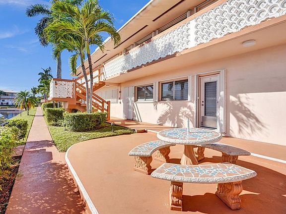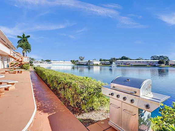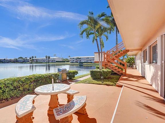 Gorgeous lake view from this 1st floor updated apartment with large open living spaces in a tranquil area. Tiled throughout, furniture included, newer appliances, hurricane accordion shutters and a patio overlooking the lake. Amenities include, pool, bocce ball, shuffleboard, clubhouse, auditorium, and there is a beautiful walking path right next to the complex. There is on site-management and the low association fee of $335 includes maintenance, insurance, reserves, and land lease fees. Great location close to restaurants, shopping, beaches, I-95 and the airport. This building has a new roof, reserves, no upcoming assessments, is 55+ and cash only.
