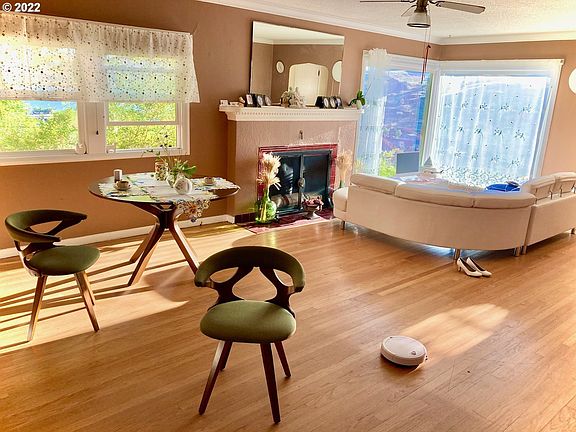 - Features: Bay Window, Builtin Features, Ceiling Fan, Fireplace, Living Room Dining Room Combo, Wood Floors