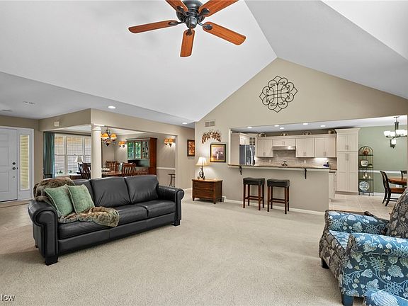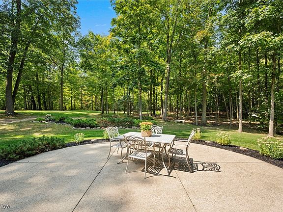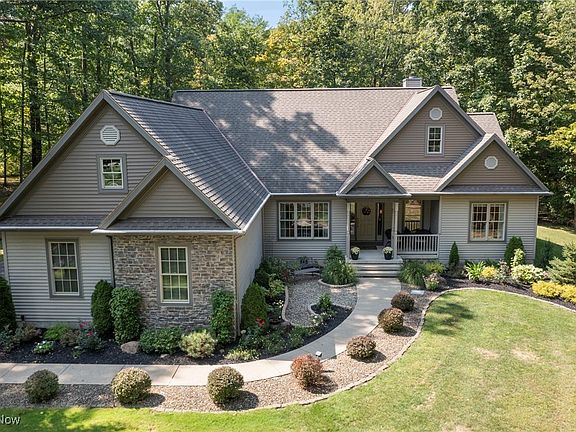 One floor living at it’s finest! Welcome to this meticulously maintained Ranch home, set back on a serene 3+ acre wooded lot. Pride of ownership shines throughout this 1-owner, pet & smoke-free residence, offering 3 bedrooms, 2.5 baths, and over 2,175 sq ft of living space. A beautifully updated eat-in kitchen offers stainless steel appliances, center island, breakfast bar, quartz countertops, stone backsplash, soft-close cabinetry w/ deep drawers & a dinette area w/ bay windows overlooking the backyard. The kitchen opens to a vaulted great room w/ a stunning floor-to-ceiling stone fireplace & palladian-style windows that frame peaceful views of the park-like backyard. A spacious dining room w/ tray ceiling is ideal for entertaining. The primary suite boasts tray ceilings, his-and-her closets, and a large ensuite bath w/ double vanities & walk-in shower. A 1st-floor laundry room w/ sink & built in counters provides added convenience and a 13-course basement offers abundant storage & endless possibilities for finishing. Outdoor living is equally inviting w/ a welcoming front porch, perfect for enjoying the quiet surroundings. The back of the home has a spacious circular patio, perfect to relax & entertain while enjoying the private yard. An attached oversized 2-car garage, equipped with hot & cold water & 220V service, and outdoor shed round out the tour. Tankless water heater provides on-demand hot water and lower utility costs. Recent updates include: Replaced kitchen cabinets, backsplash, island, breakfast bar, quartz countertops, stove, refrigerator, dishwasher, garbage disposal (2019), carpet in great room, dining room, primary bedroom (2020), painted kitchen, family, dining, laundry rooms, & primary bedroom (2020). INCLUDED are all kitchen appliances except microwave, washer/dryer, matching furniture pieces below shelves in great room. Conveniently located near OH-44, US-6, 5 miles from Chardon Square, schools, shopping, restaurants, & other local attractions.
