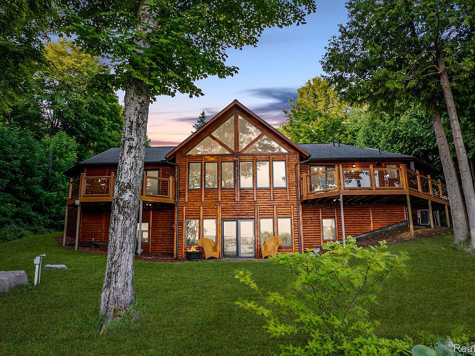 Welcome to your dream waterfront retreat! Nestled on 6.9 acres of pure natural beauty, this custom-built log home on the Cheboygan River is a sanctuary that combines rustic charm with modern luxury. With an astounding 360 feet of private frontage, you'll be captivated by the tranquility and picturesque views that surround this incredible property. As you approach the property, a long private driveway leads you to the awe-inspiring log home. Your first glimpse of the house will leave you breathless with a resounding "wow." The craftsmanship and attention to detail are evident in every aspect of the home's design. Step inside, and you'll find yourself immersed in an ambiance that embraces both elegance and coziness. Large windows throughout the house invite abundant natural light and provide uninterrupted views of the river and the lush landscape that envelops the property. From every room, be it the spacious living area, the gourmet kitchen, or the inviting bedrooms, you'll be greeted with breathtaking panoramas.