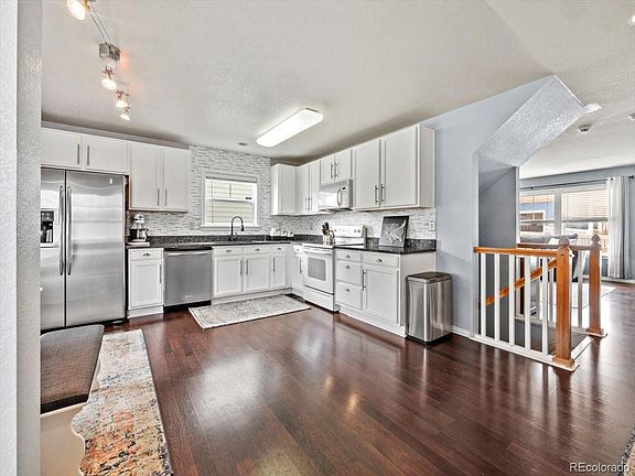 One of the best locations in Belle Creek! Quiet and serene. Featuring an updated kitchen with granite and custom tile backsplash in the eat-in kitchen with all appliances included. Nice open floor plan newer laminate /wood floors and fully fenced back yard. Roomy master suite features a walk in closet and completely updated bath. 2 more nice sized bedrooms upstairs as well as a double-vanity full bath. Close to Charter School, Family Center, multiple parks, yoga studio and corner store. Easy commute to Denver-15 minutes to Lodo! - DIA or Boulder. Buyer to verify square footage and taxes, HOA included in the taxes. Showings start Friday at 10am. Exterior of home recently painted.