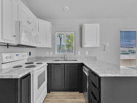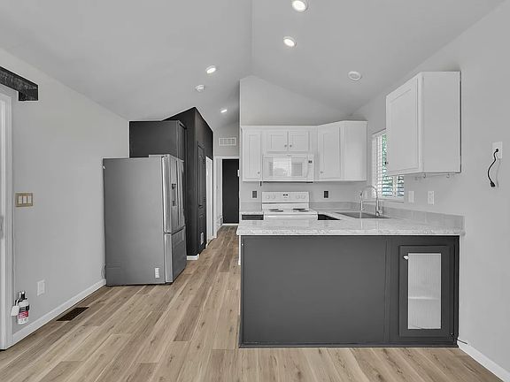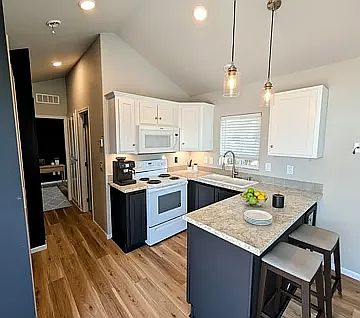 Enjoy cooking in the spacious U-shaped kitchen, designed with abundant counter space and storage. Natural light fills the home through large windows and a sliding glass door in the open-concept living room. Vaulted ceilings enhance the airy feel, creating a space that's welcoming and bright.