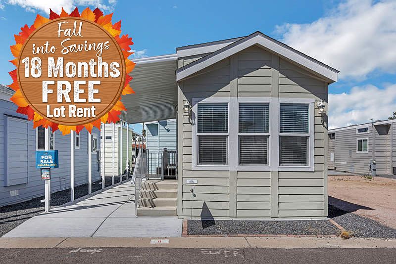 This 396 square foot park model home at Mesa Sunset RV Resort in Mesa, AZ is a cozy retreat with 1 bedroom and 1 bathroom. Built in 2023 by Cavco, this home offers a comfortable living space with a living room, master bedroom, kitchen, and breakfast nook. The exterior features a convenient carport for parking. Inside, the home is equipped with modern appliances including an oven, fridge, microwave, and hot water heater. Additional features include stainless steel appliances and central A/C to keep the home comfortable year-round.