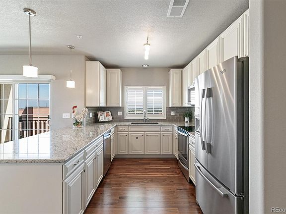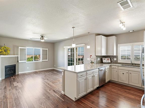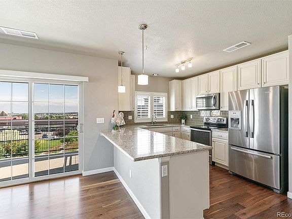 Fantastic Views of Mountains and Downtown Denver! 2 bedroom, 2 bathroom + Den condo located in the desirable Clocktower At Highlands Ranch Town Center. Once inside, you will be immediately impressed by the natural light, upgraded finishes, and laminate hardwood floors throughout. The living room is bright, open, and offers a ceiling fan for summer and a cozy gas fireplace for winter. The spacious kitchen boasts stainless steel appliances, granite countertops, and a beautiful glass tile backsplash. The two bedrooms are generously sized and offer plenty of closet space. The primary bedroom features a ceiling fan, a en suite bathroom with a large walk-in shower, and walk-in closet. The Den provides a comfortable work space behind beautiful French doors! The balcony off the living room provides a perfect spot to relax and enjoy views of the front range and downtown Denver. The secure building has ground floor entrance with an elevator, heated parking garage, and a storage area. This is a prime location, just steps away from restaurants, shopping, parks, entertainment, and miles of walking and biking trails. One block from Civic Greens Park and Douglas County Library. 2 blocks from the RTD transit station. Less than a mile from both the Westridge and Northridge Highlands Ranch Rec Centers, Children's Hospital Colorado and UC Health Highlands Ranch Hospital. Great access to C-470 from either Broadway or Lucent. You can have it all in this highly coveted Clocktower at Highlands Ranch community!