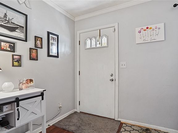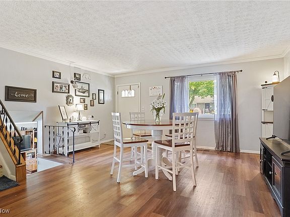 Welcome to this beautifully maintained three-level split home, ideally situated in Goodyear Heights on the edge of the Tallmadge community! Step inside to a warm and inviting living room—currently used as a dining area—featuring durable LVT flooring that flows seamlessly throughout the main and lower levels. Crown molding and freshly painted trim add a refined touch, complemented by vinyl replacement windows that provide abundant natural light throughout the home. Adjacent to the dining space, you'll find both a bright enclosed sunroom and a functional galley kitchen. The kitchen boasts maple soft-close cabinetry, solid surface countertops, a stylish tile backsplash, and stainless steel appliances—including a gas stove, microwave, dishwasher, and refrigerator—all of which stay with the home. The sunroom is a true highlight, with Nature Stone flooring and walls of windows that overlook the fully fenced backyard, complete with a storage barn—perfect for outdoor living and entertaining. Downstairs, the spacious family room is flooded with sunlight through oversized windows. This level also includes a convenient half bathroom, a utility/laundry room, and direct access to the driveway. Upstairs, you’ll find three generously sized bedrooms, a full bath, and plenty of closet and storage space. Additional Features: New hot water heater '24, Roof approximately '15. Fully fenced backyard with storage shed. Location Highlights: Steps from Eastwood Avenue and blocks from Goodyear Heights Metro Park. Minutes to shopping, dining, and fitness centers as well as easy access to State Route 76 and the Tallmadge Circle. Don’t miss your chance to own this well-cared-for, move-in-ready home in a prime location!