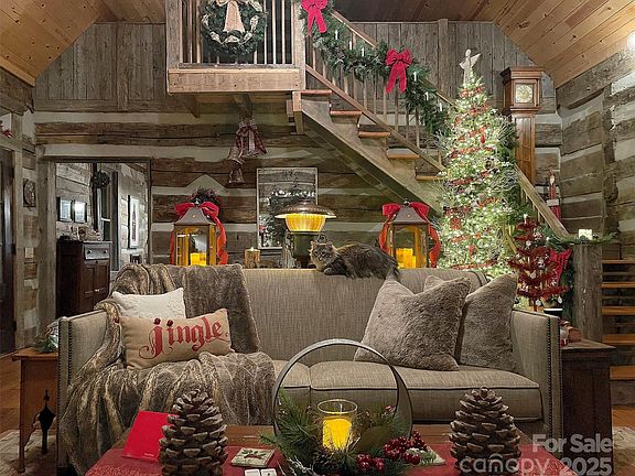 Escape to this 38.10-acre mountain farm with breathtaking views of Roan Mountain. The charming chink log cabin features 2 cozy bedrooms and 2 beautifully remodeled baths, boasting tiled walk-in showers, a clawfoot tub, and farmhouse vessel sinks. The home s rustic appeal is highlighted by a cathedral tongue-and-groove ceiling with exposed wood beams and stunning wormy chestnut floors throughout. Unique tobacco stick railings add to its authentic character. Relax on the expansive wrap-around porch, soaking in panoramic mountain views. The property includes a large barn, studio, and a 2-car detached garage, all crafted with the same logs as the home. Ideal for homesteading, it offers fenced areas for small farm animals, animal stalls, a chicken coop, and a greenhouse. Perfect for those seeking a serene, self-sustaining lifestyle surrounded by nature s beauty. There is so much more to see!! Don t miss this rare opportunity to own a slice of mountain paradise!