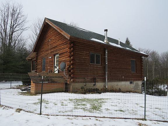 Whoa ! Stop looking - this is it !! A secluded log home on 8.9 acres bordering State Forest Lands!! 2 Bedroom plus a loft Bedroom, full unfinished basement, large pond, and an oversized 2-car garage. Lots to love here !!
