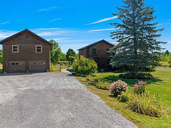 Welcome home to this stunning log home with an oversized heated garage, set on 3.34 open acres with apple trees, grapes, plum trees, and your very own private pond. A flagstone walkway leads you to the covered front porch and into a home that immediately welcomes you with gorgeous wood beams, vaulted ceilings, and the warmth of a brand new Hearthstone soapstone woodstove. The open-concept first floor, with sliders to the expansive back deck, is perfect for family gatherings or quiet evenings taking in the craftsmanship and serene setting. The deck has been thoughtfully modified to create multiple spaces for entertaining and relaxing, and it flows seamlessly to a stone patio with hot tub, firepit, and beautifully landscaped perennial beds—all ideal for soaking in sunsets over the pond and wooded backdrop. The spacious first-floor primary ensuite offers double closets and room for a cozy sitting area. Upstairs you’ll find two bedrooms, an office, a full bath, and a bright balcony sitting area. The full basement is ready to adapt to your needs—whether storage, fitness, or recreation space. Car enthusiasts and hobbyists will love the 3+ bay heated garage, once used as a shop, with soaring ceilings high enough for a lift, plus an upstairs office/hangout room and storage. An attached shed off the back adds even more utility. With school choice and close proximity to Lake Champlain, this property combines rustic charm with thoughtful updates in a serene setting.