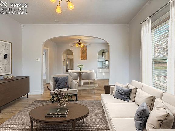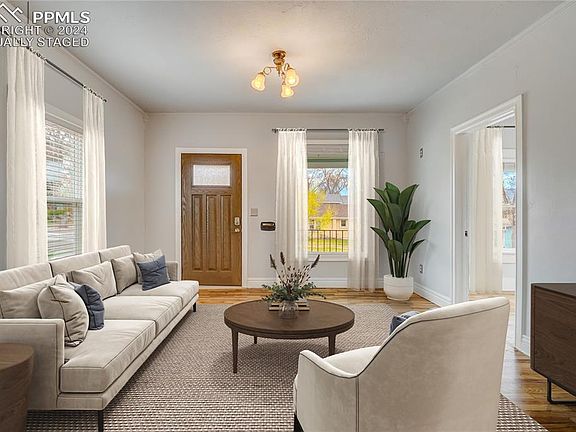 Updated charming bungalow, offers comfort, convenience & modern upgrades throughout. Located in the desirable downtown/Patty Jewett Golf Course area. Walk to nearby parks/legacy loop trail/open space, Taylor Elementary school, easy access to shopping, entertainment, Memorial hospital & main roads. The covered porch captures views of the mountains offering a spot to slow down & take in the setting. entry opens to solid hardwood floors that flow throughout the main level. The bright & open great room boasts craftsman touches tall ceilings w/decorative crown molding, modern designer paint colors, large newer energy efficient windows w/ views of the landscape letting the natural light pour in. The adjoining formal dining space w/beautiful, exposed brick chimney offers a flexible space for those large gatherings. Opening to the remodeled kitchen w/white wood cabinets w/updated oil rubbed bronze hardware, stainless-steel refrigerator, dishwasher, pantry & subway tile pattern backsplash. 2 generous main level bedrooms both have hardwood floors, newer modern ceiling fans & easy access to updated full bath. The bathroom has new large format tile floor, modern vanity, wains coting wall & newer shower surround. The basement has a laundry room w/storage and large open room for workshop, music room, & more. Outside the backyard boasts multiple places to enjoy the CO outdoors w/a raised deck, concrete patio, & large level fenced yard. Grow a garden or another building! easy to maintain front & side yards have xeriscaping. Additional highlights include detached 1 car garage with door opener, energy efficient vinyl windows, high speed internet & more! This home is surrounded by all the modern amenities yet minutes from Colorado’s great outdoors. See it today!