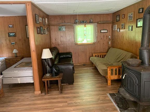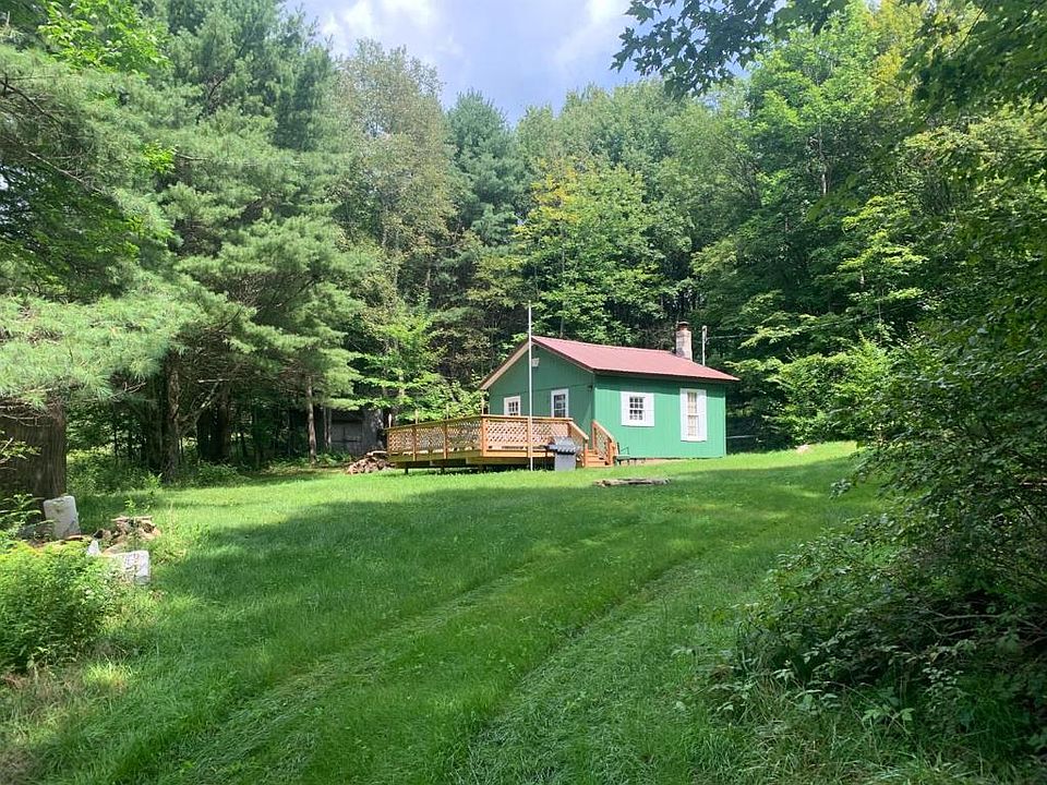The owner put his heart & soul into this place, it was a labor of love. Situated on about 5.90 acres, this adorable little cabin is set up to be a great getaway. The landscape is mostly open with lush blueberry bushes and apple trees. The exterior was painted just a month ago. The flooring was put in 4 years ago. There is a beautiful Vermont castings wood stove for heating. New deck and outhouse added in 2020. New storm door and exterior lights installed very recently. This cabin could be used as a weekend getaway as is or with a little investment this place could be turned into a year round home. Cabin comes furnished and includes contents of the shed (mower, weed whackers, garden tools, etc.).