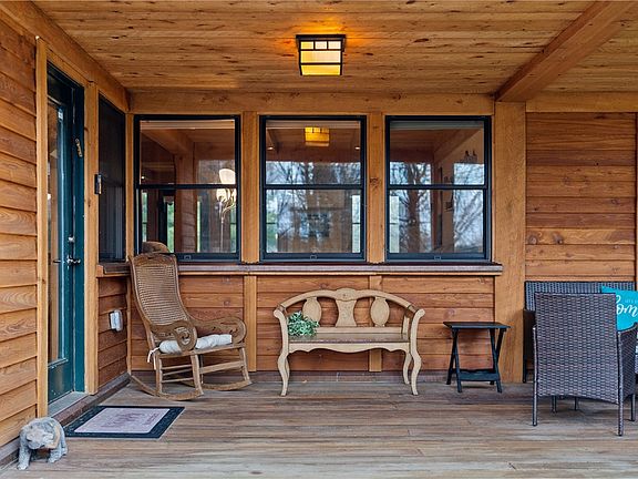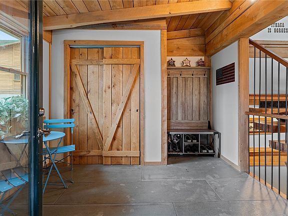 Embrace the tranquility of your own peaceful retreat just moments away from downtown Ithaca and the captivating Finger Lakes region! This energy-efficient smart home, constructed in 2018, even offers a peek of winter lake view. Step inside to discover slate and bamboo floors, high ceilings, sliding barn doors, and exposed wood beams. The open-concept layout features a well-appointed kitchen, boasting cherry cabinets, stainless steel appliances, soft-close drawers, and granite countertops, flowing to the dining and living area.  The flexible floor plan currently features a bedroom and full bath on each of the three levels for ultimate privacy.  Ascend the rustic live-edge staircase to uncover the primary bedroom suite with a clawfoot tub for ultimate relaxation. The walk-out lower level stays toasty with radiant floor heat. Enjoy comfort with mini-split AC and unwind on the large rear deck and patio. A perfect blend of rustic charm and chic, modern amenities. With proximity to hiking trails, wineries, and cultural attractions, this is your chance to experience the best of Ithaca living!