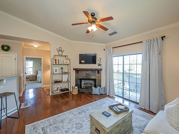 This is the one you have been waiting for! You will love the well manicured gated luxury. This condo is just a two minute walk to the gorgeous pool, clubhouse and greenspace. Beautiful open plan with lots of natural light, smooth ceilings, hardwoods, granite countertops, crown molding and so many special touches. The foyer opens to the dining room and living room with a pretty tile fireplace. There is a balcony off the living room perfect for rocking chairs on cool evenings. There is a dining area and nice breakfast bar area for entertaining, plenty of cabinets and all the stainless steel appliances remain in the kitchen. Full size laundry room off the kitchen. Work from home? There is a cozy nook off the master bedroom for your desk. The master has a nice walk in closet, garden tub, separate shower and double vanity. Bedroom two is also spacious with it's own good size bath. This home is move in ready and has been well maintained. Come take a look...you'll want to stay.